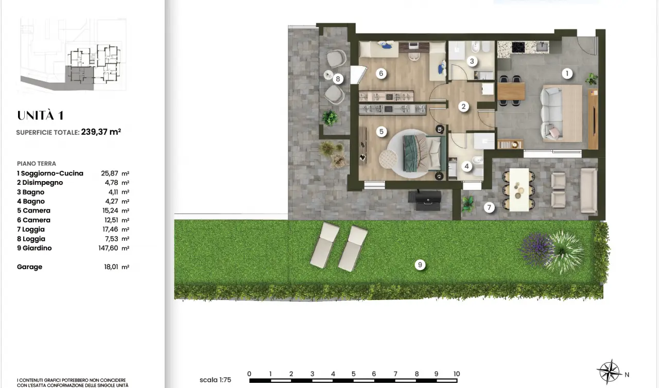 -L’appartamento è al piano terra con giardino privato di 150 mq;